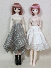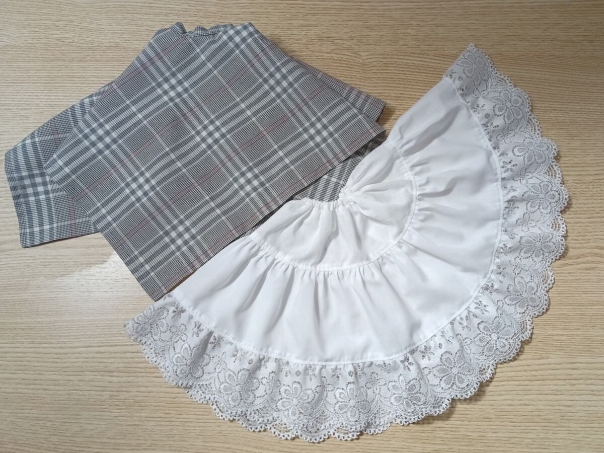 本体はシンプルですが、裾に幅広レースのついた別履きのペチコートが付属し、重ねるとスカートの丈の短い部分からレースが覗きます。